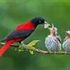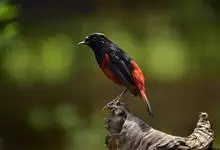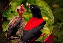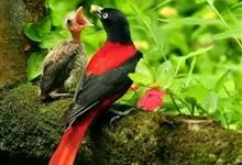 朱鹂:中等鸟类,体长23-28厘米。雄鸟绛紫红色,头、上胸及翼黑色。雌鸟上背及背部深灰色,尾覆羽及尾绛紫红色,腹部及下胸白而密布黑色纵纹。与鹊色鹂幼鸟的区别在上背灰色较深,下体白色较少且纵纹较粗。…全部>>