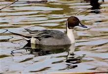 针尾鸭,是雁形目鸭科鸭属动物。体长约75厘米的大型戏水鸭,雄鸟头暗褐色,颈侧有白色纹路,向下与胸部白色相连,中央一对尾羽特别长;背灰色,有黑色细纹;翼镜绿色,胸腹白色,尾下覆羽黑色;雌鸟体羽大致为褐色,…全部>>