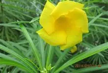 黄花夹竹桃K. Schum.),又名“酒杯花”“柳木子”“黄花状元竹”,是夹竹桃科,黄花夹竹桃属下的常绿乔木植物。高达5m,全株无毛,树皮棕褐色;叶互生,近革质,线形或线状披针形;花大,黄色,具香味,…全部>>