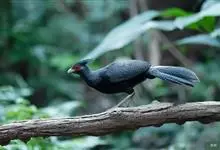 黑鹇是鸡形目雉科目鹇属鸟类,又称鸬雉、黑鸡。体型中等。雄鸟上体黑褐色,背羽具黑紫色金属光泽;头顶具黑羽冠;脸部裸皮呈红色,散生稀疏黑色纤羽;尾长而侧扁,中央两对尾羽红褐色,…全部>>