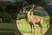 水鹿是偶蹄目鹿科鹿属哺乳动物,又称黑鹿、春鹿、山牛。身体高大粗壮。头骨细长,鼻骨、额骨发达,颈部较长;四肢细长,主蹄大,侧蹄小;长尾巴的两侧密生着长毛。雄性头上有角,角从额部的后外侧生出,稍向外倾斜,…全部>>