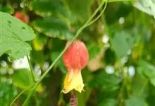 红萼苘麻是锦葵科、苘麻属常绿软木质灌木,叶绿色,长5-10厘米,心形,叶端尖,叶缘有钝锯齿,有时分裂,有细细的叶柄;叶互生,掌状叶脉;花单生于叶腋,具长梗,下垂;花萼红色,半套着大约4厘米长的花瓣,…全部>>