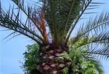 加那利海枣是棕榈科刺葵属植物,单干直立,自然高度可达18米,干径50-90厘米,幼时被以枯叶,老树则叶柄基部残存。具波状叶痕,羽状复叶,顶生丛出。雌雄异株,肉穗花序自叶间抽出,长可达2米。浆果,…全部>>