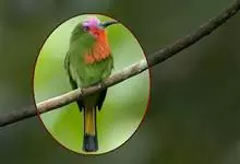 蓝喉蜂是蜂虎科蜂虎属鸟类。体长26-28厘米,嘴长而弯曲,有明显细长的中央尾羽。头部、颈部和背部为巧克力色,有黑色眼纹。喉部、腰部和尾羽为蓝色。腹部和两翼为绿色。幼鸟外观似成鸟,头部、颈部和背部为绿色,…全部>>