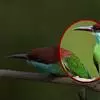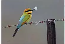 栗喉蜂虎是蜂虎科蜂虎属的鸟类。有热带鸟类羽毛艳丽的特征:喉部是栗红色的,黑色的过眼纹,翅膀和背部是绿色的,尾翼是蓝色的,飞行时翅膀下面的羽毛是橙黄色的,在阳光的照射下,它们全身闪烁着金属般的艳丽光泽,…全部>>