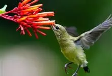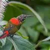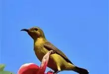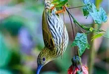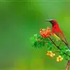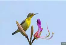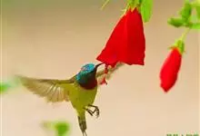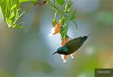 绿喉太阳鸟:共有9个亚种。小型鸟类,雄鸟体长13-15厘米、雌鸟10-12厘米。雄鸟前额至后颈、颏和喉辉绿色,头侧黑色,颈侧和背暗红色,两肩、下背橄榄绿色,腰鲜黄色,尾上覆羽和中央尾羽暗绿色,…全部>>