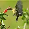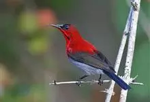 叉尾太阳鸟,雀形目太阳鸟科太阳鸟属留鸟;为小型鸟类,雄鸟头顶辉蓝绿色,上体橄榄绿色,腰明黄色,中央尾羽亮翠蓝色,羽轴针状延长,外侧尾羽黑色具白色端斑,头侧黑色,颜、喉和胸为绛红色,…全部>>