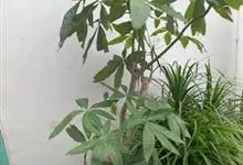 瓜栗 Walp. ),俗称发财树,木棉科小乔木,高4-5米,树冠较松散,幼枝栗褐色,无毛。小叶具短柄或近无柄。花单生枝顶叶腋;花梗粗壮,被黄色星状茸毛,脱落;萼杯状,近革质;花瓣淡黄绿色,狭披针形…全部>>