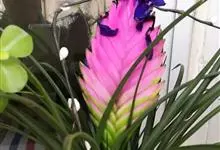 紫花凤梨,是凤梨科铁兰属的多年生草本植物。株高不及30厘米;叶片拱状线形,叶丛族生于短缩茎上,斜出或横生,叶为绿色,基部具有紫褐色彩晕;短穗状花序,总苞片粉红色,呈扇形;小花青紫色,…全部>>