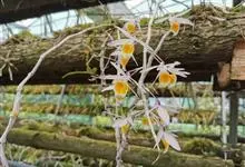玫瑰石斛是兰科石斛属的多年生附生草本植物。茎斜下或下垂,青绿色,圆柱形,节间鞘具绿或白色相间的条纹;叶窄披针形;花序短,生于已落叶的老茎上部,花序梗长,萼片和花瓣白色,上部带淡紫色,干后蜡质状,…全部>>