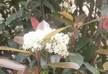 石楠 Kalkman),是蔷薇科石楠属的常绿乔木,高5~12米,株型紧凑,树冠圆球形。树枝为褐灰色;鳞片为褐色,没有毛;叶片革质,长椭圆至侧卵状椭圆形,有锯齿,新叶红色光亮。复伞房花序,白色小花,…全部>>