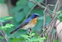 山蓝仙鹟:小型鸟类,体长13-15厘米。雄鸟额基和眼先黑色,颏橙棕色,仅颏尖为蓝黑色,喉、胸、上腹和两胁亦为橙棕色,下体白色范围较小,仅局限于下腹和尾下覆羽。雌鸟上体少黄色,颏、喉、胸概为锈红色,…全部>>