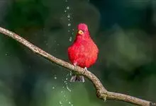 血雀雀科朱雀属鸟类,体重36-49克;体长155-182毫米。雄鸟除眼先、翼与尾为黑色外,通体为鲜红色;嘴鲜黄;雌鸟暗橄榄绿色,羽端较淡或带黄色;腰鲜黄;嘴较暗。虹膜褐色;嘴黄色;腿和脚褐色。…全部>>