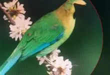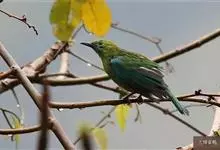 蓝翅叶鹎:小型鸟类,体长15-18厘米。雄鸟通体草绿色,尾蓝绿色,肩和翅亮蓝 色,胸缀有黄色,颏、喉黑色。雌鸟颏,喉蓝绿色。栖息在海拔1500米以下的常绿阔叶林、次生林和林缘疏林灌丛中。…全部>>