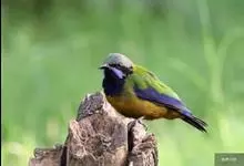 金额叶鹎是和平鸟科、叶鹎属的鸟类。体长16-20厘米。额和头顶前部金桔色,整个上体包括两翅表面草绿色。颏、喉黑色,其外围有一圈黄色,其余下体浅绿色,翼缘蓝紫色,翅上小覆羽翠蓝色。野外特征极明显,…全部>>