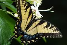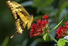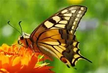 金凤蝶,是鳞翅目凤蝶科凤蝶属动物。金凤蝶为中型凤蝶,翅展70-84毫米,翅背面底色黑褐色,翅脉黑色,翅室具黄斑;前翅背面基部呈暗黄色,亚外缘为黑色,内具一列小黄斑;后翅背面亚外缘区具黑宽边,…全部>>