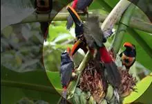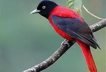 朱鹂:中等鸟类,体长23-28厘米。雄鸟绛紫红色,头、上胸及翼黑色。雌鸟上背及背部深灰色,尾覆羽及尾绛紫红色,腹部及下胸白而密布黑色纵纹。与鹊色鹂幼鸟的区别在上背灰色较深,下体白色较少且纵纹较粗。…全部>>