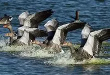 灰雁:体长70-90厘米,翼展147-182厘米,体重2.5-4千克,寿命17年。体大而肥胖。嘴、脚肉色,上体灰褐色,下体污白色,飞行时双翼拍打用力,振翅频率高。脖子较长。腿位于身体的中心支点,…全部>>