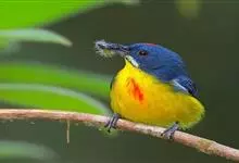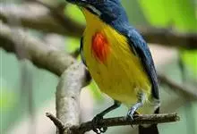黄腹啄花鸟:体重11-16克,体长104-117毫米。是一种体型大,下腹部为艳黄色的啄花鸟,雄鸟特征为头黑色,喉部有白色纵斑、喉侧及上体成对比,两翅和尾黑色,外侧尾羽内翈具白色斑块。其余下体淡黄色。…全部>>