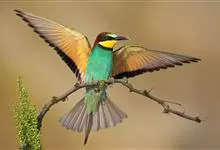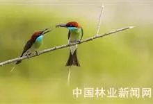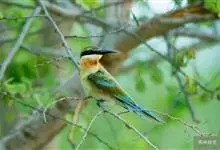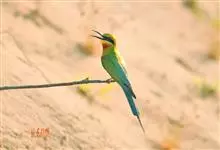 栗喉蜂虎是蜂虎科蜂虎属的鸟类。有热带鸟类羽毛艳丽的特征:喉部是栗红色的,黑色的过眼纹,翅膀和背部是绿色的,尾翼是蓝色的,飞行时翅膀下面的羽毛是橙黄色的,在阳光的照射下,它们全身闪烁着金属般的艳丽光泽,…全部>>