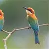 蓝喉蜂是蜂虎科蜂虎属鸟类。体长26-28厘米,嘴长而弯曲,有明显细长的中央尾羽。头部、颈部和背部为巧克力色,有黑色眼纹。喉部、腰部和尾羽为蓝色。腹部和两翼为绿色。幼鸟外观似成鸟,头部、颈部和背部为绿色,…全部>>