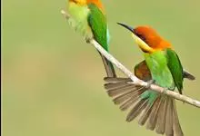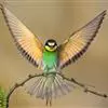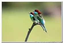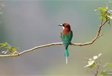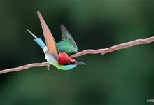 栗喉蜂虎是蜂虎科蜂虎属的鸟类。有热带鸟类羽毛艳丽的特征:喉部是栗红色的,黑色的过眼纹,翅膀和背部是绿色的,尾翼是蓝色的,飞行时翅膀下面的羽毛是橙黄色的,在阳光的照射下,它们全身闪烁着金属般的艳丽光泽,…全部>>