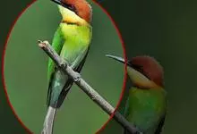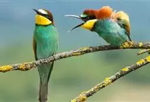 蓝喉蜂是蜂虎科蜂虎属鸟类。体长26-28厘米,嘴长而弯曲,有明显细长的中央尾羽。头部、颈部和背部为巧克力色,有黑色眼纹。喉部、腰部和尾羽为蓝色。腹部和两翼为绿色。幼鸟外观似成鸟,头部、颈部和背部为绿色,…全部>>