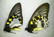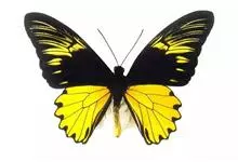 金裳凤蝶是凤蝶科、裳凤蝶属的动物。金裳凤蝶身体呈黑色,头、颈和胸侧有红毛,腹部有黑黄两色相间条纹,雄蝶前翅黑色,具黑天鹅绒光泽,各脉两侧灰白色,后翅金黄色,各室外缘有等腰三角形黑斑1枚,斑内侧有晕,…全部>>