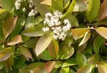 石楠 Kalkman),是蔷薇科石楠属的常绿乔木,高5~12米,株型紧凑,树冠圆球形。树枝为褐灰色;鳞片为褐色,没有毛;叶片革质,长椭圆至侧卵状椭圆形,有锯齿,新叶红色光亮。复伞房花序,白色小花,…全部>>