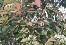 石楠 Kalkman),是蔷薇科石楠属的常绿乔木,高5~12米,株型紧凑,树冠圆球形。树枝为褐灰色;鳞片为褐色,没有毛;叶片革质,长椭圆至侧卵状椭圆形,有锯齿,新叶红色光亮。复伞房花序,白色小花,…全部>>