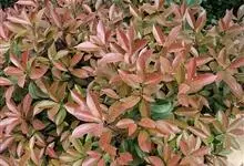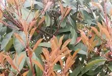 红叶石楠 是蔷薇科,石楠属杂交种,为常绿小乔木或灌木,乔木高可达5米、灌木高可达2米。叶片革质,长圆形至倒卵状、披针形,叶端渐尖,叶基楔形,叶缘有带腺的锯齿,花多而密,复伞房花序,花白色,梨果黄红色,…全部>>