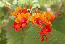 洋金凤 Sw.),豆科小凤花属灌木状或小乔木植物,枝无毛,绿或粉绿色;二回羽状复叶;总状花序伞房状,萼片无毛,花瓣橙红或黄色,圆形,花丝红色,子房无毛,花柱橙黄色;荚果窄而薄,…全部>>