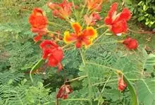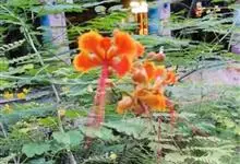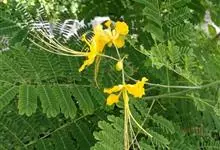洋金凤 Sw.),豆科小凤花属灌木状或小乔木植物,枝无毛,绿或粉绿色;二回羽状复叶;总状花序伞房状,萼片无毛,花瓣橙红或黄色,圆形,花丝红色,子房无毛,花柱橙黄色;荚果窄而薄,…全部>>