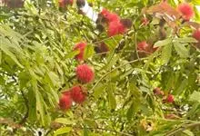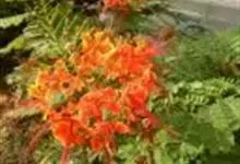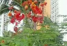 洋金凤 Sw.),豆科小凤花属灌木状或小乔木植物,枝无毛,绿或粉绿色;二回羽状复叶;总状花序伞房状,萼片无毛,花瓣橙红或黄色,圆形,花丝红色,子房无毛,花柱橙黄色;荚果窄而薄,…全部>>