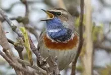 蓝点颏亦称“蓝喉歌鸲”,通称蓝靛颏儿。身体大小和麻雀相似,体长12-13厘米,体重17-18克。头部、上体主要为土褐色。眉纹白色。尾羽黑褐色,基部栗红色。颏部、喉部辉蓝色,下面有黑色横纹。下体白色。…全部>>