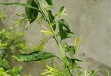 夜香树是茄科、夜香树属直立或近攀援状灌木。枝条细长而下垂。叶有短柄,叶片矩圆状卵形或矩圆状披针形,全缘,顶端渐尖,基部近圆形或宽楔形,两面秃净而发亮,有6-7对侧脉。伞房式聚伞花序,腋生或顶生,…全部>>