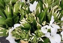 姜花又名野姜花。是姜科姜花属的多年生草本植物,茎高1-2米;叶片长圆状披针形或披针形,叶面光滑,叶背被短柔毛;穗状花序顶生,椭圆形,花芬芳,白色;蒴果卵状三棱形,微黄绿色;种子鲜红色,具橘红色的假种皮。…全部>>