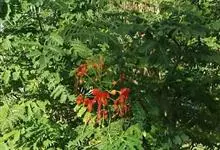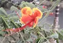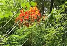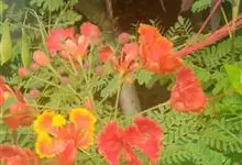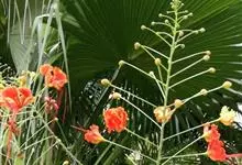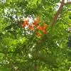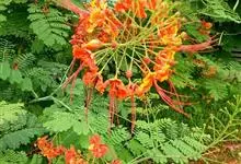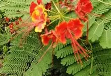 洋金凤 Sw.),豆科小凤花属灌木状或小乔木植物,枝无毛,绿或粉绿色;二回羽状复叶;总状花序伞房状,萼片无毛,花瓣橙红或黄色,圆形,花丝红色,子房无毛,花柱橙黄色;荚果窄而薄,…全部>>