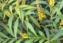 十大功劳 Fedde),小檗科十大功劳属常绿灌木植物。叶子较大且较多,呈椭圆形,绿色,表面光滑无毛,叶柄较长;花朵较小,呈多边形,黄色,花瓣对称分布,表面有绒毛;果实呈圆形,褐色,…全部>>