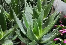 芦荟 Burm. f.)是百合目阿福花科多年生草本植物。常绿,地上茎很短;叶片肥厚多汁,呈狭披针形,基部宽阔为粉绿色,边缘有刺状小齿;花有黄色或赤色斑点;果实呈三角形;种子多数。花期在冬末。…全部>>