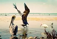 褐鹈鹕:是鹈鹕家族中体型最小的成员。体型粗大,体重6.5-9千克。嘴形宽大直长,上嘴尖端朝下弯曲,呈钩状;下嘴分左右二支,其间有一巨大而能扩缩的皮肤喉囊;鼻孔小,而位于嘴基。眼前部裸出。颈长而较细小…全部>>