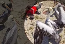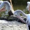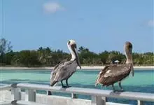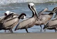褐鹈鹕:是鹈鹕家族中体型最小的成员。体型粗大,体重6.5-9千克。嘴形宽大直长,上嘴尖端朝下弯曲,呈钩状;下嘴分左右二支,其间有一巨大而能扩缩的皮肤喉囊;鼻孔小,而位于嘴基。眼前部裸出。颈长而较细小…全部>>