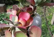 唐印为景天科伽蓝菜属的多年生肉质草本植物。植株中型,株高50厘米,宽20厘米,多分枝;叶片肉质,对生,卵形,全缘,先端钝圆,叶片淡绿色至灰绿色,表面被有厚厚的白粉,光照充足时,叶缘呈红色;圆锥花序,…全部>>