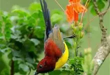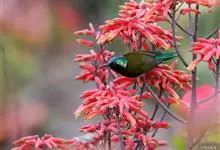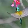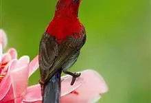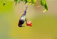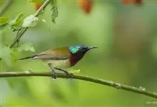 叉尾太阳鸟,雀形目太阳鸟科太阳鸟属留鸟;为小型鸟类,雄鸟头顶辉蓝绿色,上体橄榄绿色,腰明黄色,中央尾羽亮翠蓝色,羽轴针状延长,外侧尾羽黑色具白色端斑,头侧黑色,颜、喉和胸为绛红色,…全部>>