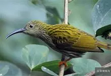 纹背捕蛛鸟:为太阳鸟科捕蛛鸟属的鸟类。是太阳鸟科中体型较大的一种,体重25-45克,体长160-210毫米。嘴粗长而尖且向下弯曲。上体橄榄黄色具黑色中央斑纹。下体淡黄白色满布黑色纵纹,尾具黑色次端斑。…全部>>