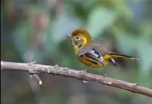 斑喉希鹛小型鸟类,体长14~17厘米。头具羽冠,前额和头顶羽冠金黄褐色,头侧灰黄色具黄色眼圈。上体灰橄榄绿色,外侧飞羽表面橘黄色、基部具黑色翼斑;内侧飞羽表面淡灰色具黑色亚端斑和白色端斑。尾羽黑色,…全部>>
