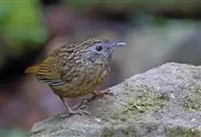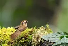 白腹幽鹛,是画眉科幽鹛属鸟类,共有4亚种。雕雄羽色相似。 上体从头到尾包括两题表面概为微椎褐色,两翅和尾沾更多红色。眼先和颚上灰褐色,耳覆羽褐色具族色羽轴纹,颈与背同色。额、喉白色具矢状黑斑,…全部>>