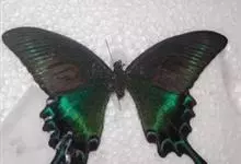 巴黎翠凤蝶中型凤蝶,躯体黑褐色,散布绿色亮鳞。后翅M3脉端有一明显叶状尾突。翅背面底色黑褐色,密布亮鳞,后翅前侧有一枚蓝绿色亮斑,与后翅中央之绿色亮线连接。后翅臀区有一紫红色圈纹。翅腹面底色褐色,于…全部>>