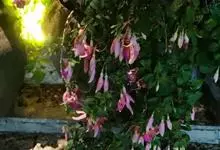 倒挂金钟是柳叶菜科倒挂金钟属亚灌木植物。茎直立,多分枝;幼枝带红色,被短柔毛与腺毛,老时渐无毛;叶对生,卵形或窄卵形,脉常带红色;常带红色,被短柔毛与腺毛;花筒红色,筒状钟形,…全部>>