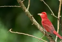 普通朱雀是雀形目雀科朱雀属鸟类,又名红朱雀、马料、青麻料。雄鸟上体红色,下体淡红色;头部、喉部、胸部及腰部亮红色;背部褐色染红色;两翼及尾黑褐色,羽缘染红色。雌鸟上体橄榄褐色,下体近白色,…全部>>
